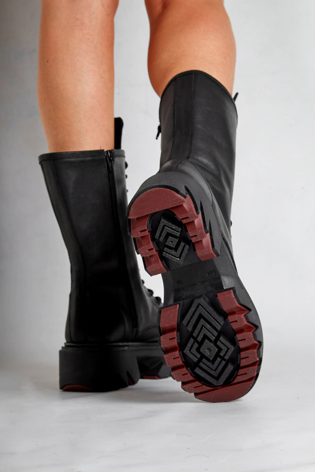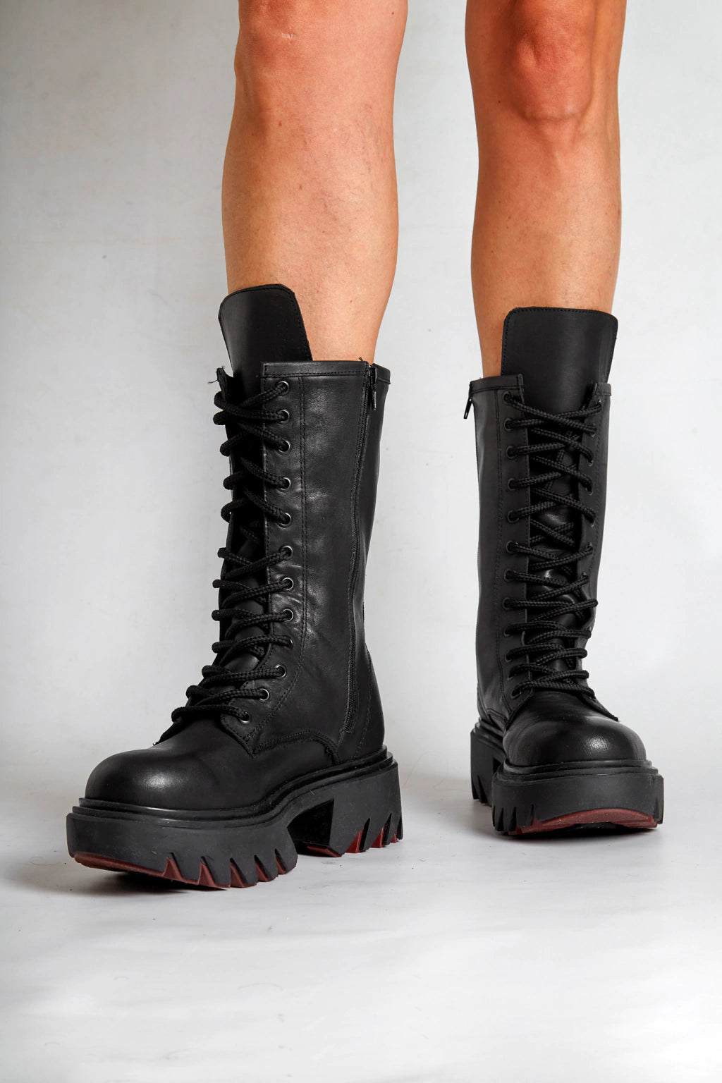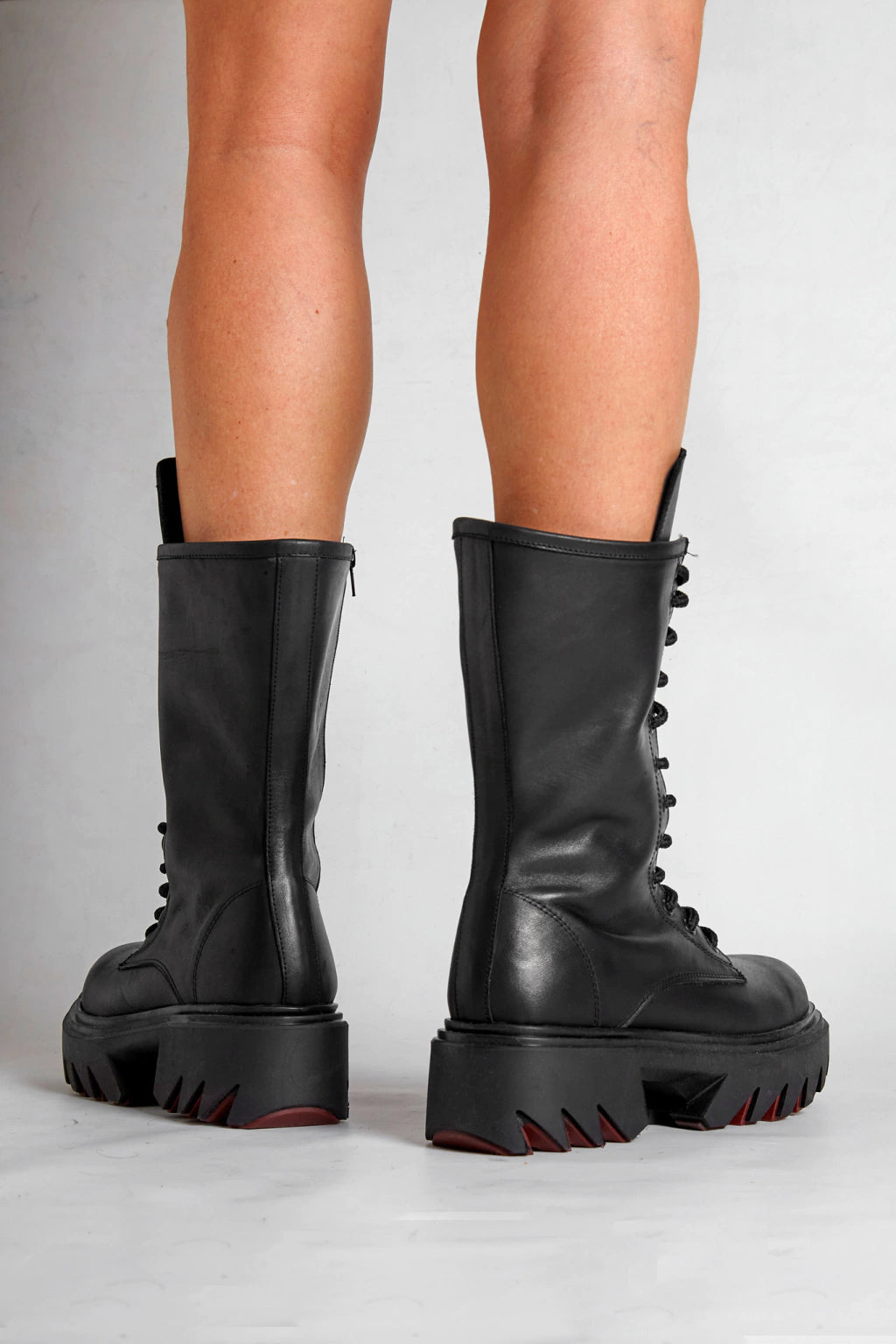 Borcegos de cuero con cordones y base de 3 cm y taco de 4 cm de alto. Caña de 24 cm de alto. Industria Argentina.