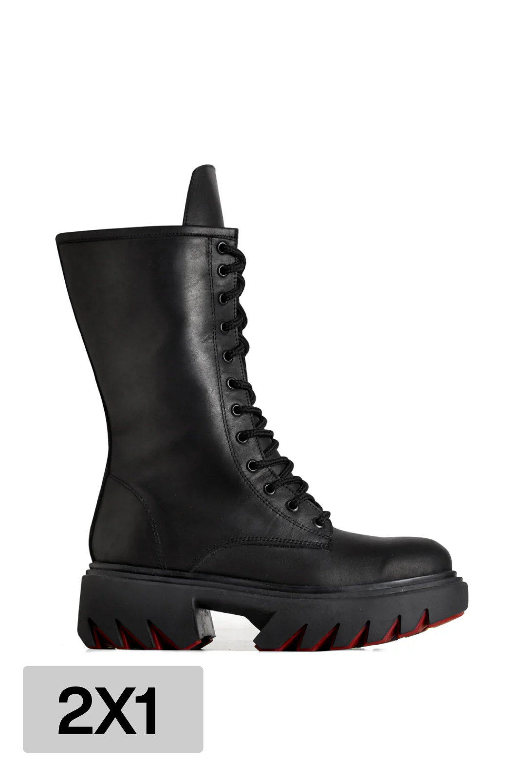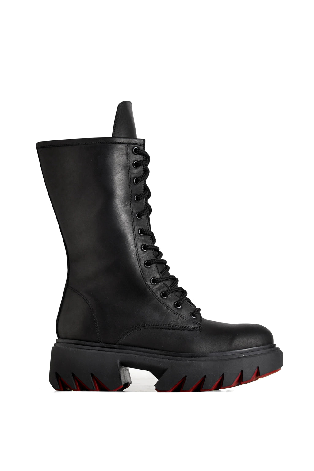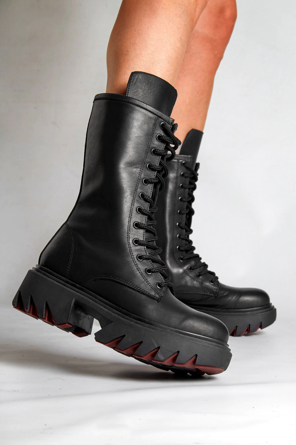 Borcegos de cuero con cordones y base de 3 cm y taco de 4 cm de alto. Caña de 24 cm de alto. Industria Argentina.