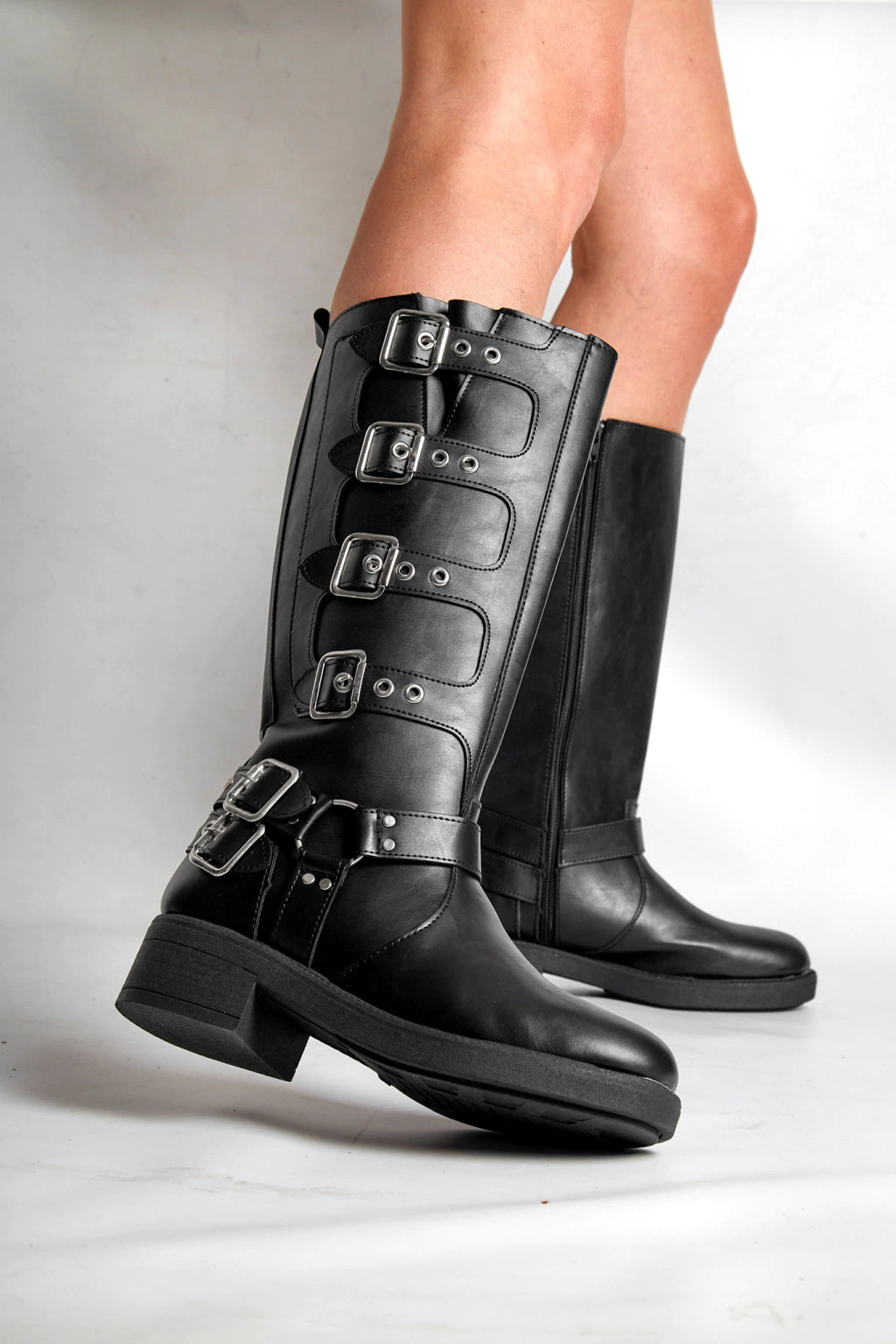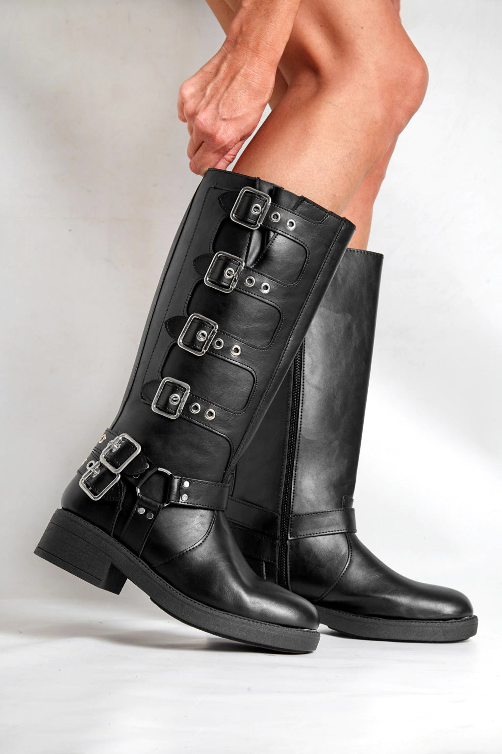 Borcegos de ecocuero, con hebillas en los costados y cierre. Altura de caña 33,5 cm, alto de base 5 cm. Industria Argentina.