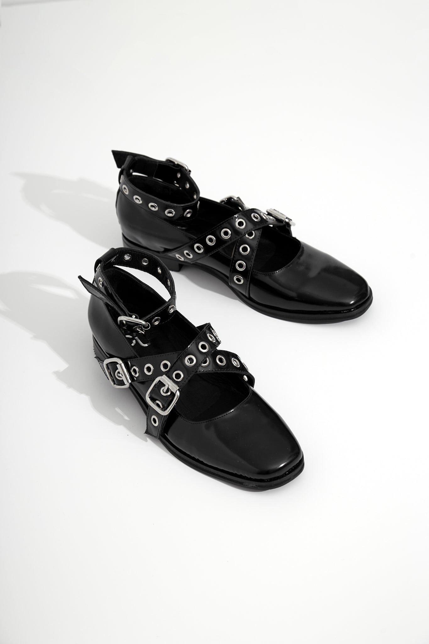Chatas de cuero con tiras cruzadas con tachas. Industria Argentina.