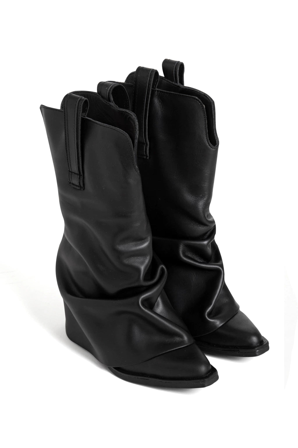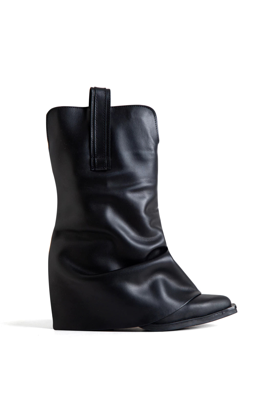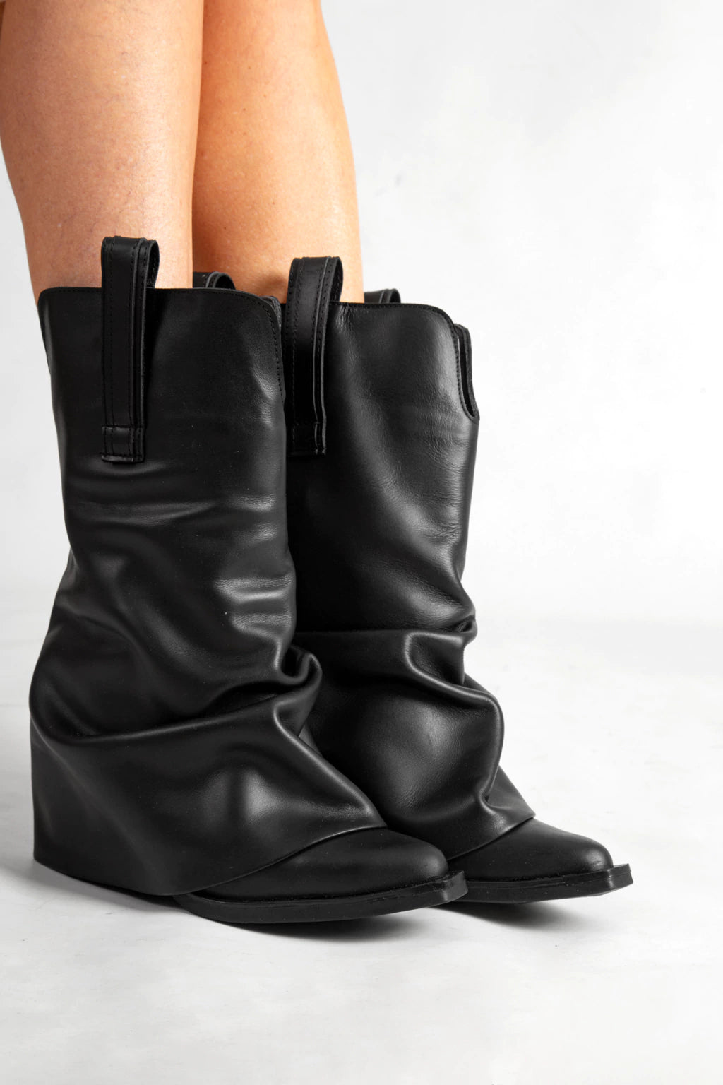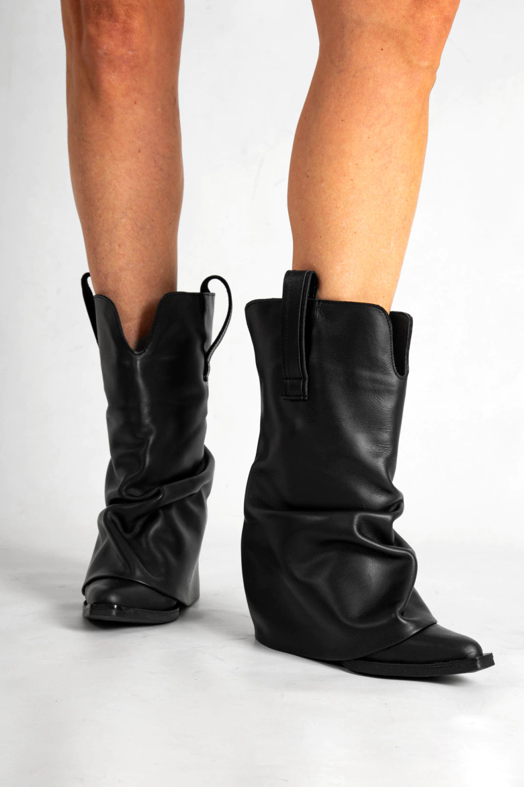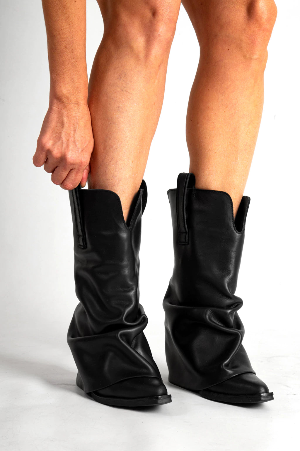 Texanas de cuero arrugadas con botamanga de cuero con apliques color plata. taco de 7,5 cm de alto. Industria Argentina.